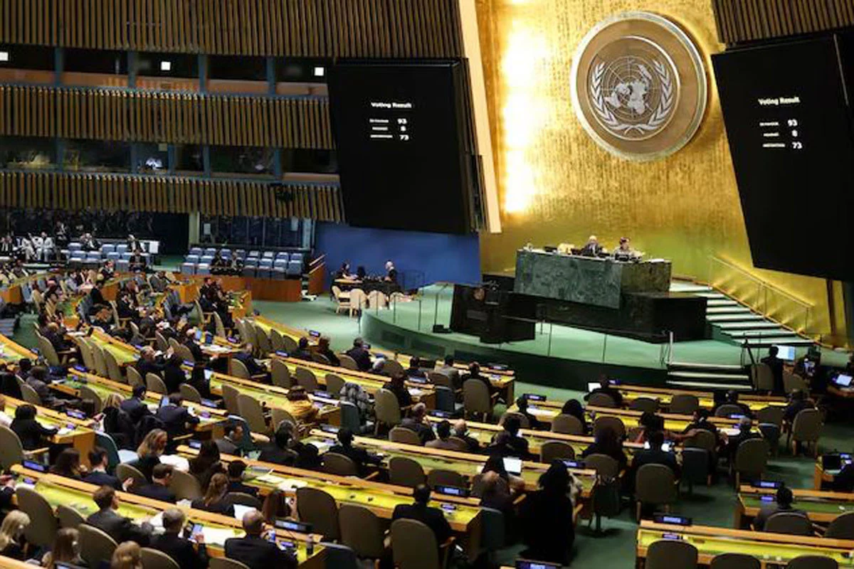 জাতিসংঘের সাধারণ পরিষদ প্রথমে ৯৩-১৮ ভোটে ইউক্রেনের প্রস্তাব অনুমোদন করে, যেখানে ৬৫টি দেশ ভোটদানে বিরত থাকে। এই ফলাফল ইউক্রেনের প্রতি কিছুটা কমে আসা সমর্থনকে প্রতিফলিত করে, কারণ আগের ভোটে ১৪০টিরও বেশি দেশ রাশিয়ার আগ্রাসনের নিন্দা জানিয়ে অবিলম্বে সেনা প্রত্যাহার ও ইউক্রেনের চারটি অঞ্চল সংযুক্তির প্রত্যাহারের দাবি করেছিল।